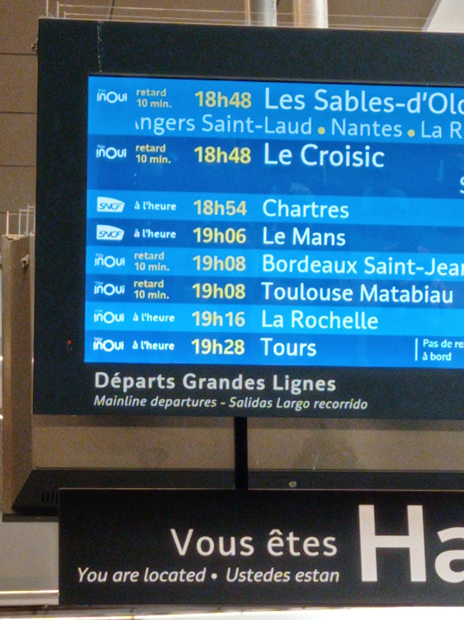 Gare ou je prends assez souvent les TGV à des destinations diverses pour des raisons professionnelles. Tout est indiqué Je prends des TGV pour l Ouest et le le Sud Ouest,il n presque pas de retard. Ce qui est à déplorer C est l insécurité qui se banalise :Les pickpockets Roms qui ne s inquiètent pas puisqu'il n y a pas de policiers. Les vigiles s enfoutent. Il y a aussi un TRÈS grand nombre de SDF.