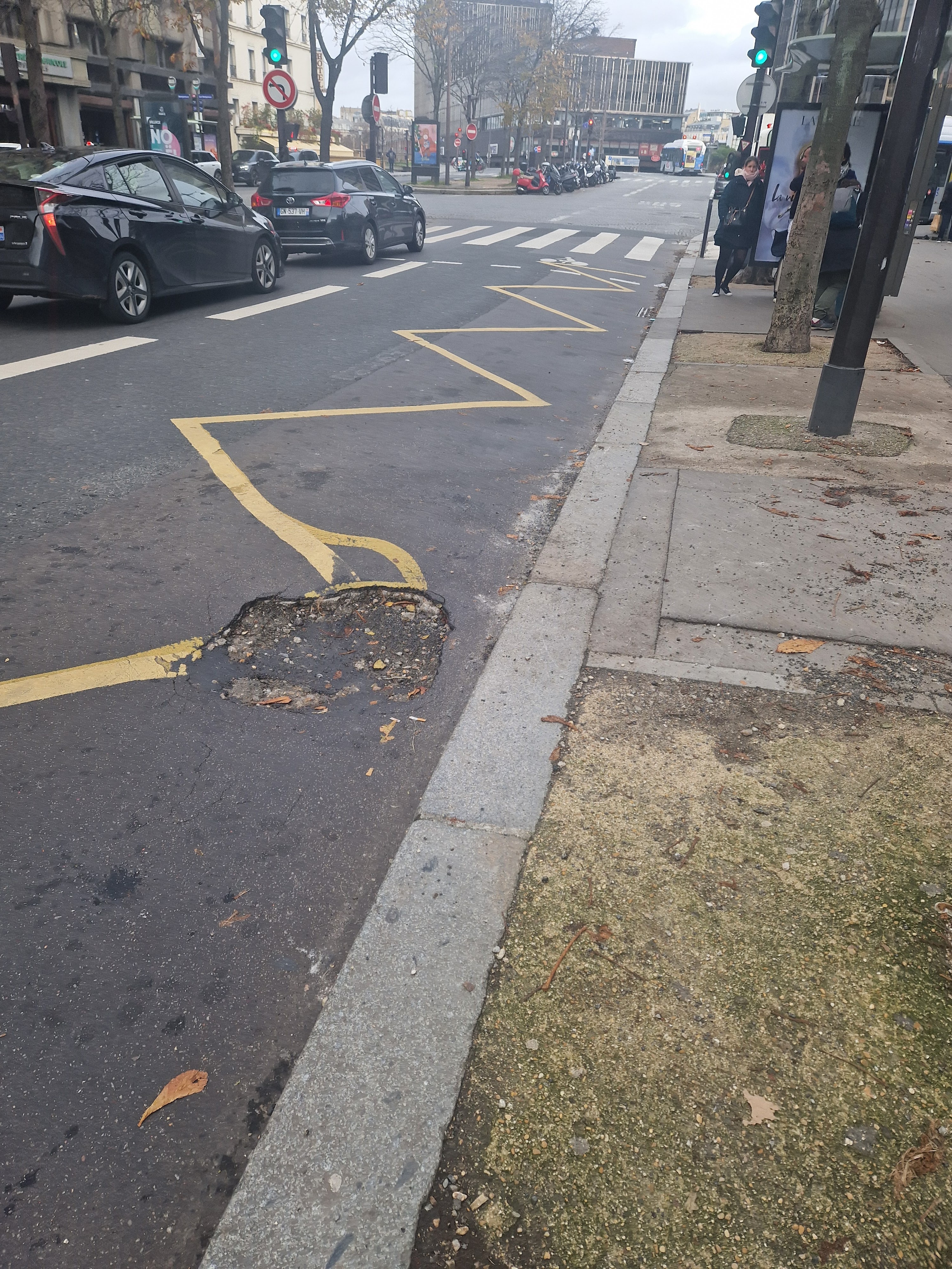 Je prend mon bus la ou il a l'arrêt de bus 39, 91, 95 a la gare de Paris montparnasse il a un énorme trou sur la route je pense que sa peu être dangereux